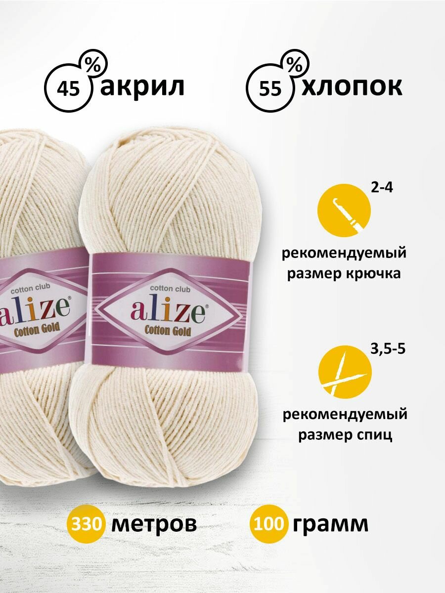 Пряжа Alize Cotton Gold (Ализе Коттон Голд) - 1 моток 67 молочно-бежевый 55% хлопок, 45% акрил 330м/100г