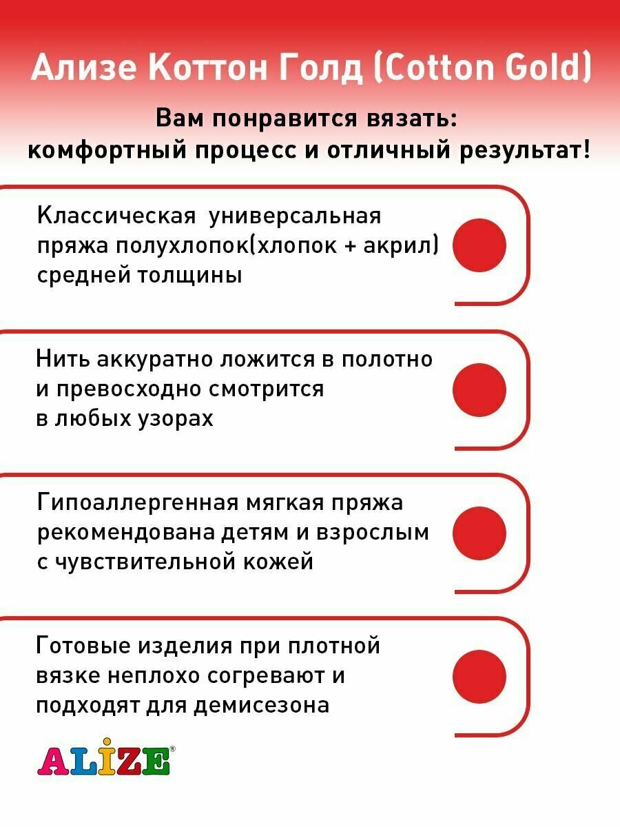 Пряжа для вязания ALIZE 'Cotton gold', 100г, 330м (55% хлопок, 45% акрил), ТУ (56 красный), 5 мотков