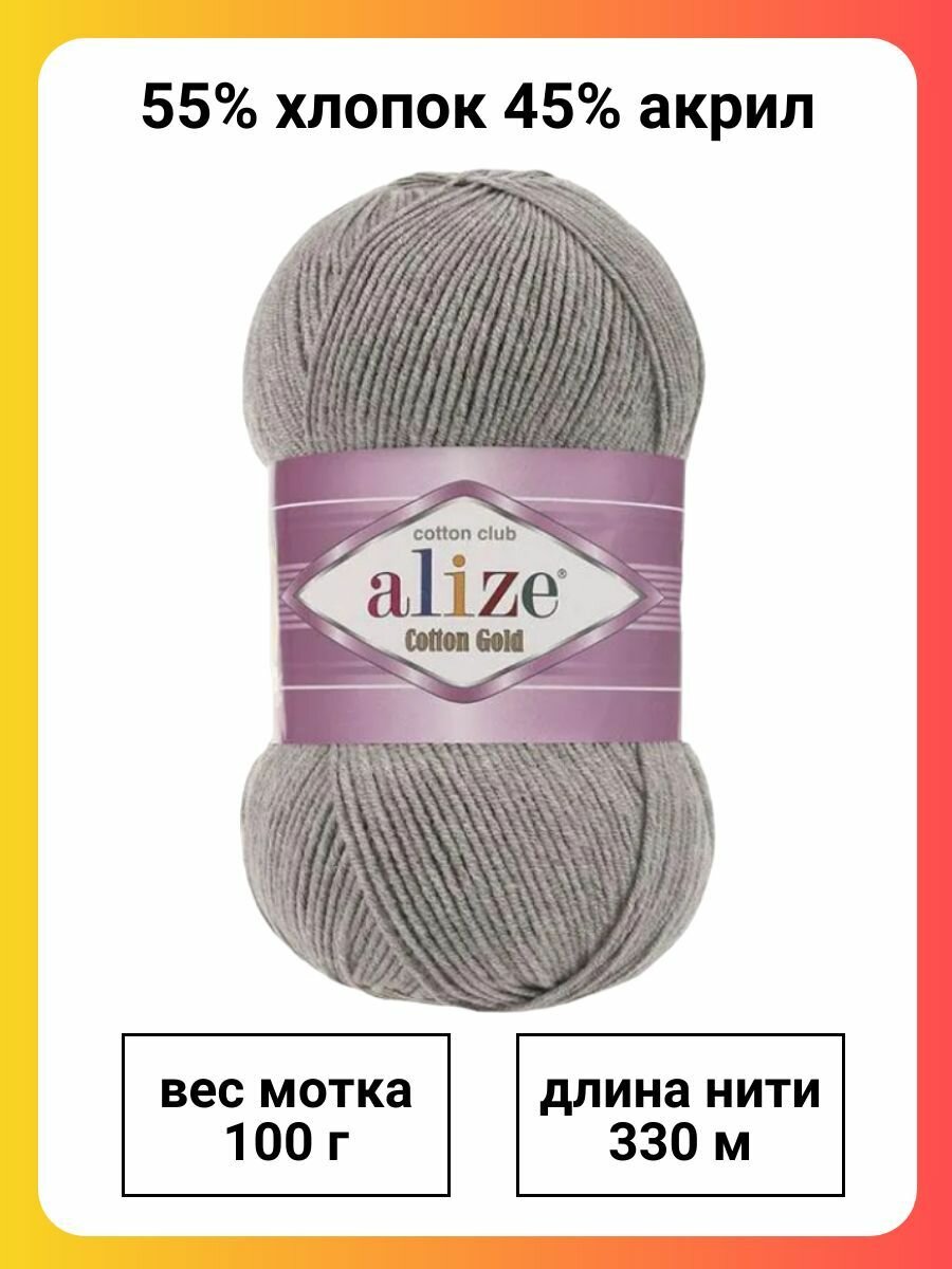 Пряжа ALIZE "Cotton gold", 100 гр 330 м, 55% хлопок, 45% акрил, ТУ 200 серый, 5 шт