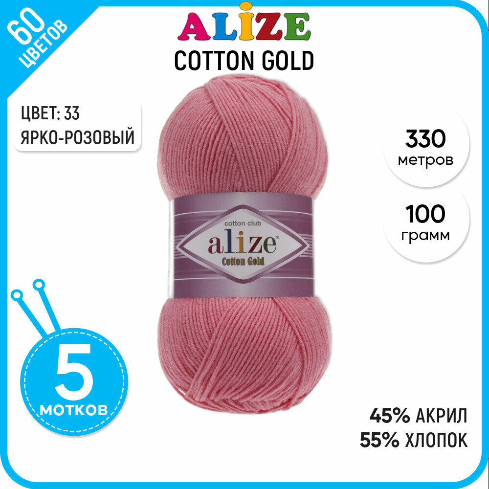 Пряжа ALIZE "Cotton Gold", 100 г, 330 м, 55% хлопок, 45% акрил, цвет 33 ярко-розовый, 5 мотков