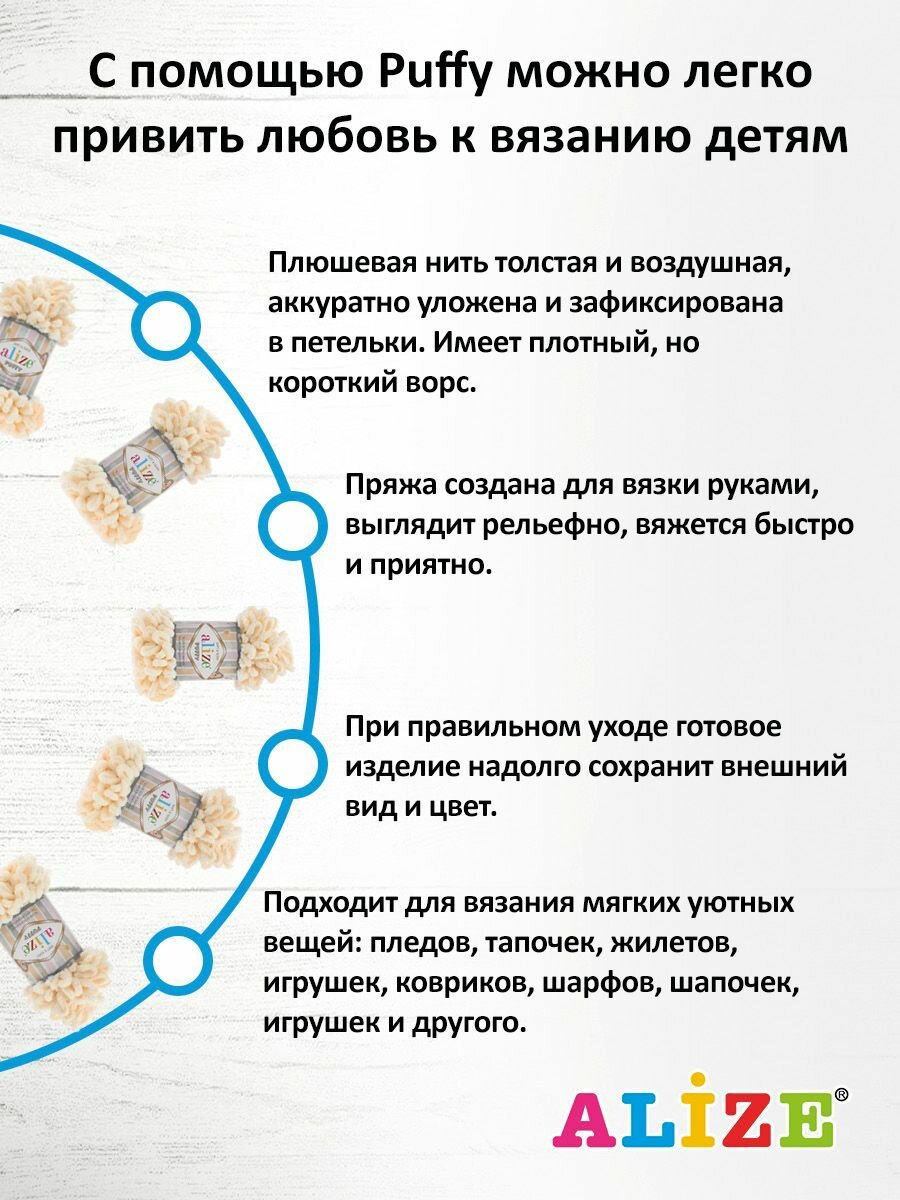 Пряжа плюшевая Alize Puffy (Ализе Пуффи) - 1 моток 262 бежевый для вязания руками, гипоаллергенная, большие петли (4см), 9м/100г