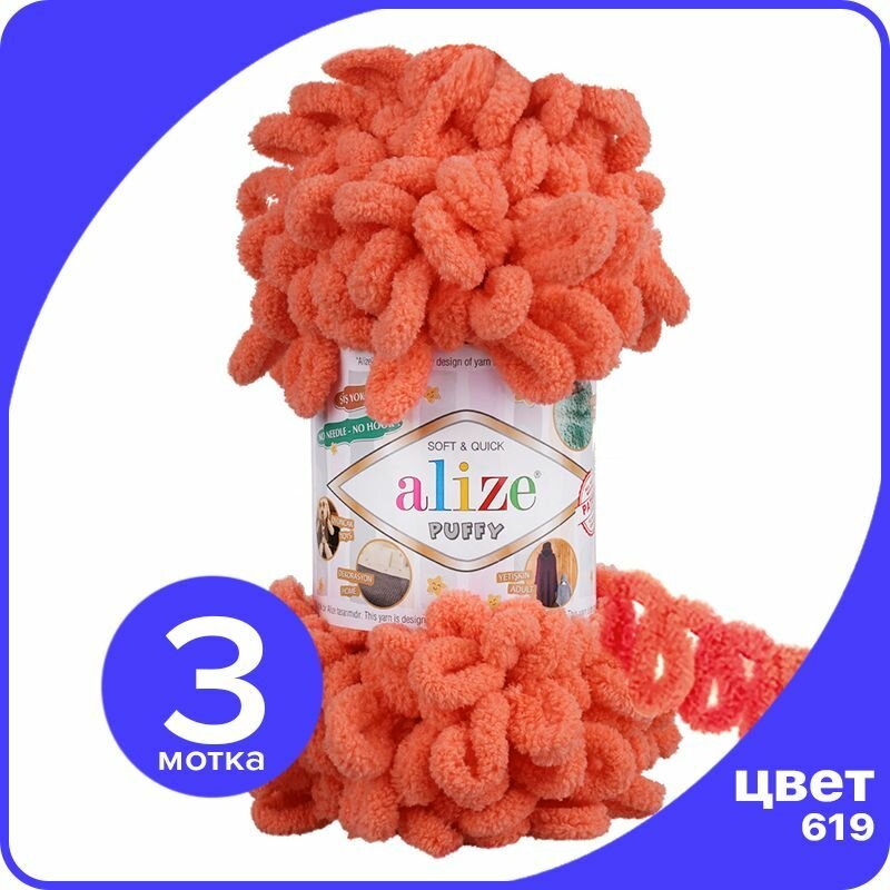 Пряжа плюшевая Alize Puffy (Ализе Пуффи) - 1 моток 619 коралловый для вязания руками, гипоаллергенная, большие петли (4см), 9м/100г