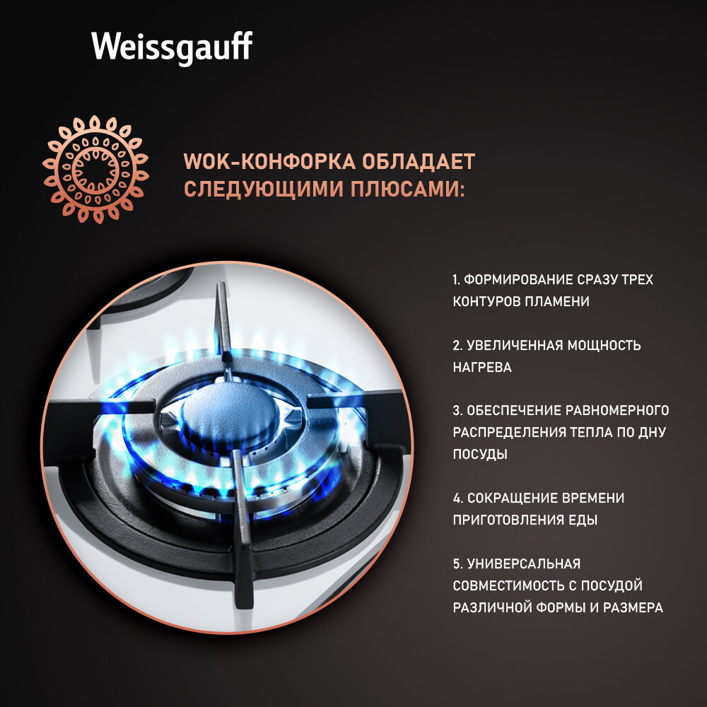 Газовая панель Weissgauff HGG 451 WGH WOK-конфорка, 3 года гарантии, автоматический электроподжиг, Рукоятки Hi-Tech, газ-контроль