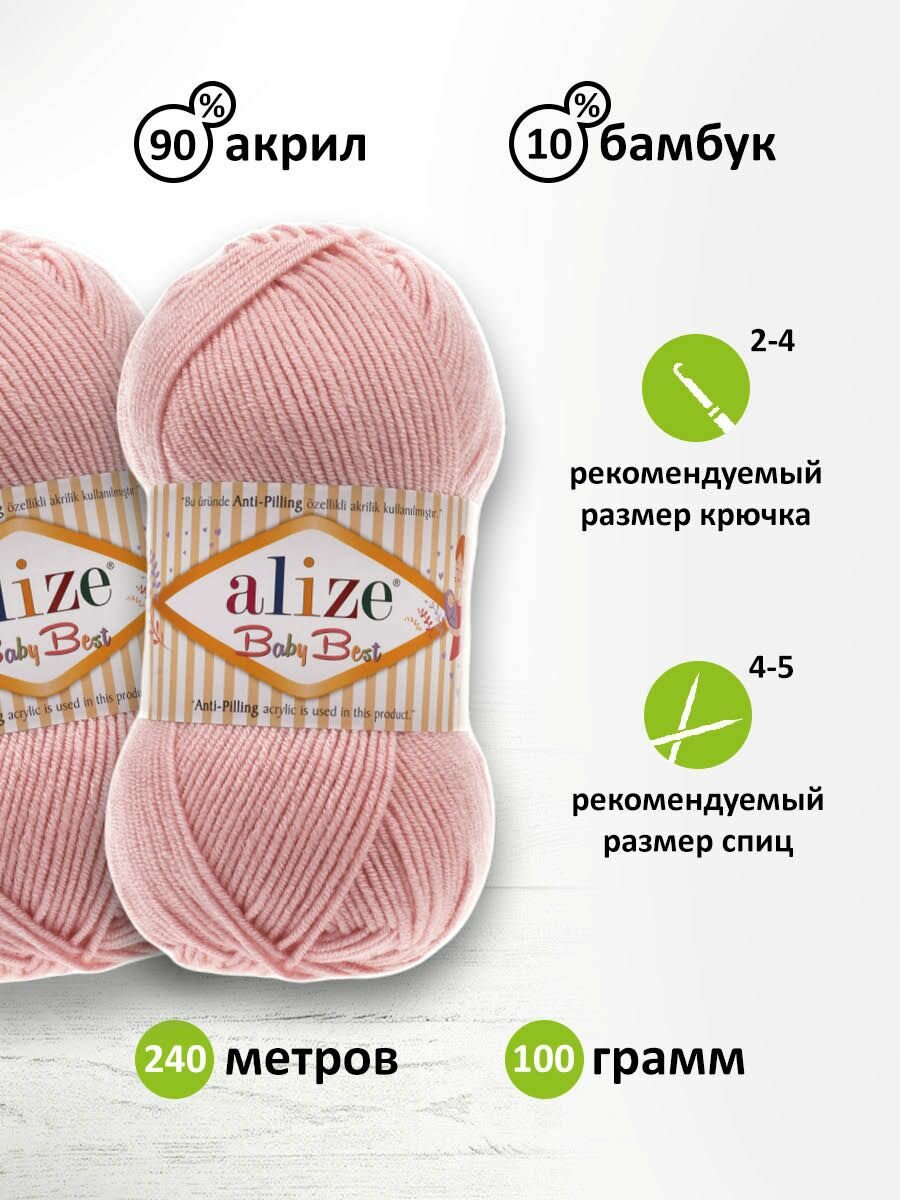 Пряжа для вязания Alize 'Baby Best', 100г, 240м (10% бамбук, 90% акрил), с эффектом антипиллинг (185 светло-розовый), 5 мотков
