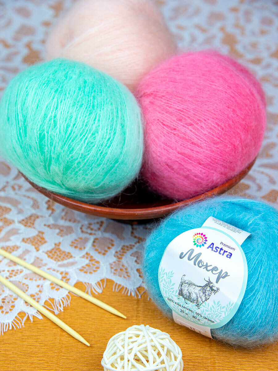 Пряжа Astra Premium "Mohair", 25 г, 190 м, 50% кид мохер, 50% акрил, цвет 36 Голубая бирюза, 4 мотка