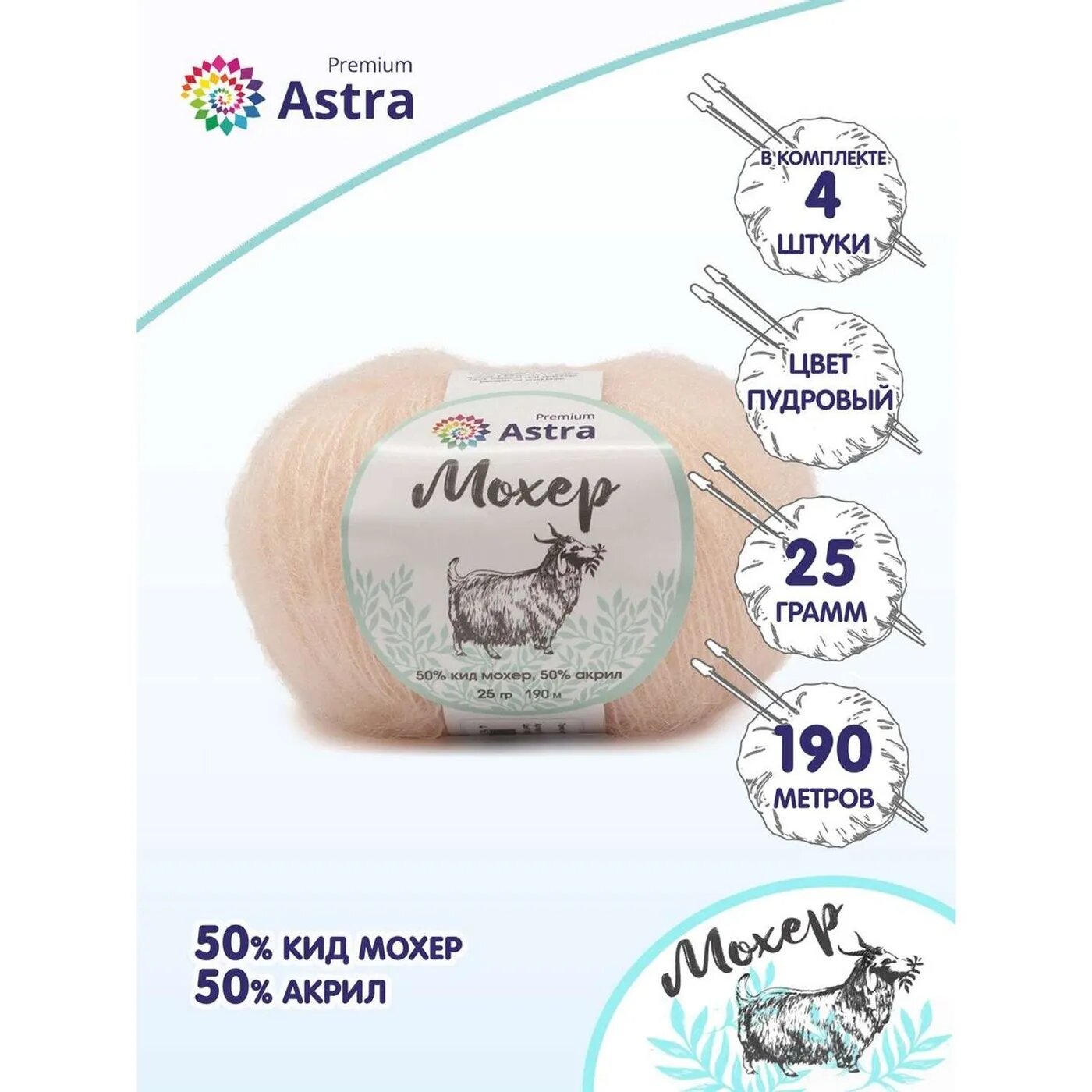 | Комплектация | Упаковка 4 штук Пряжа Astra Premium 'Мохер' (Mohair) 25гр 190м (+/-5%) (50% кид мохер, 50% акрил) (41 пудровый) |