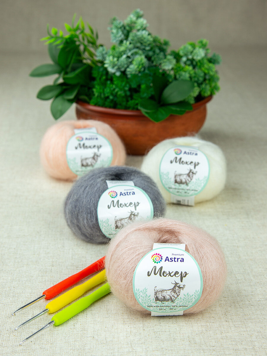 | Комплектация | Упаковка 4 штук Пряжа Astra Premium 'Мохер' (Mohair) 25гр 190м (+/-5%) (50% кид мохер, 50% акрил) (41 пудровый) |