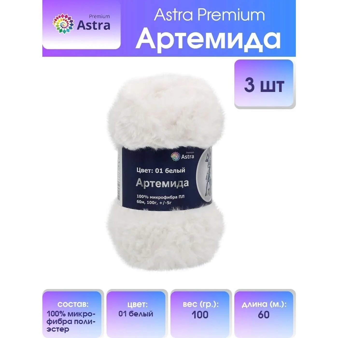 | Комплектация | Упаковка 3 штук Пряжа Astra Premium 'Артемида' 100гр. 60м (100% микрофибра ПЛ) (01 белый) |