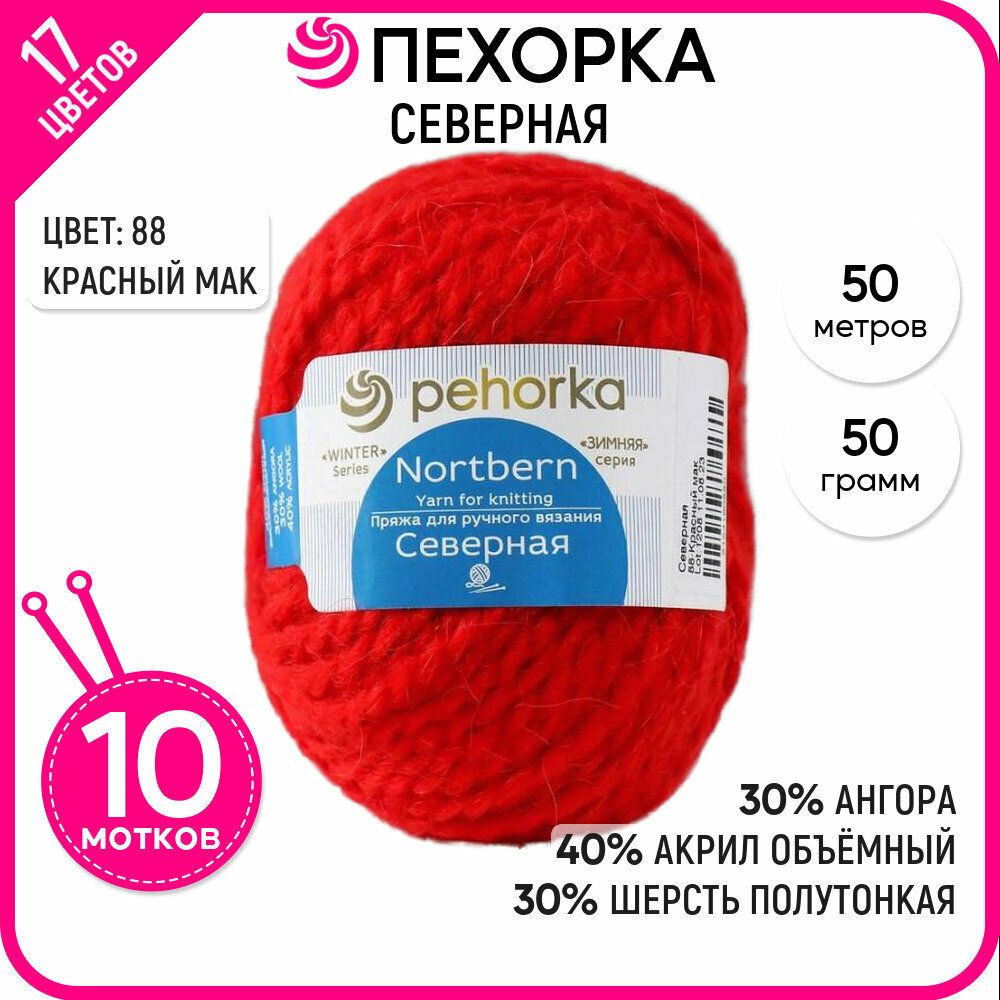 Пряжа Пехорский текстиль "Северная", 40% акрил, 30% ангора, 30% полутонкая шерсть, 50+-3 м, №088, цвет Красный мак, 10 шт по 50 г