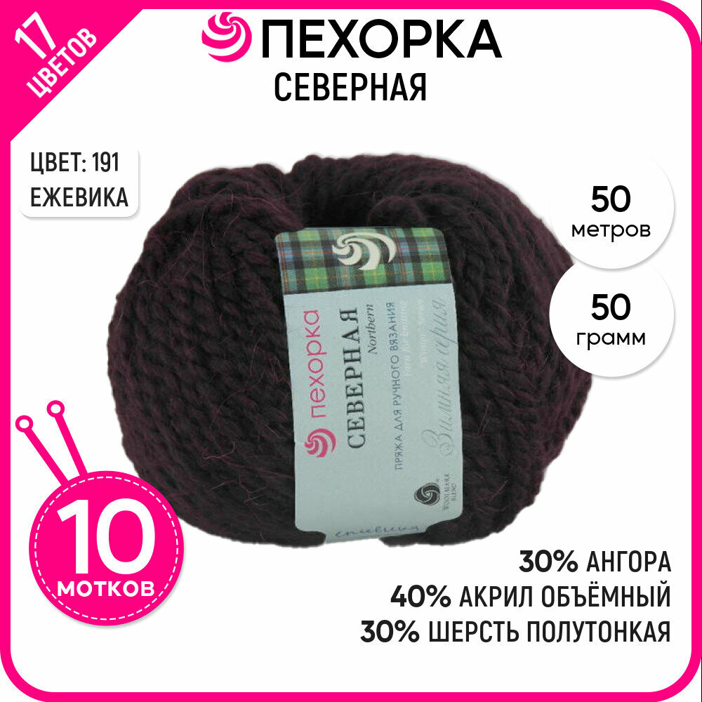Пряжа Пехорский текстиль "Северная", 40% акрил, 30% ангора, 30% полутонкая шерсть, 50+-3 м, №191, цвет Ежевика, 10 шт по 50 г