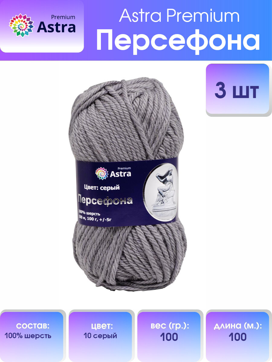 Купить Пряжа для вязания Astra Premium 'Персефона', 100, 100м (100% шерсть) (10 серый), 3 мотка
