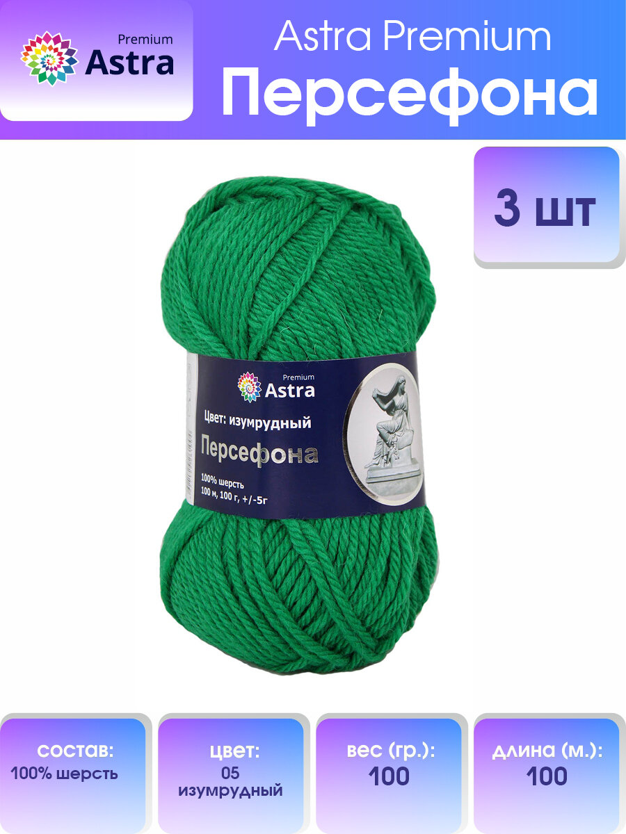 Купить Пряжа Astra Premium "Персефона", 100 гр 100 м, 100% шерсть, 05 изумрудный, 3 шт