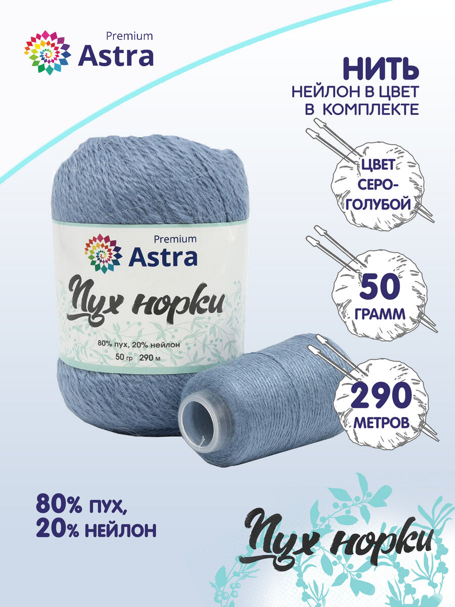 Пряжа Astra Premium "Пух норки", 50 гр 290 м, 80% пух, 20% нейлон, нить 20 гр, 064 серо-голубой