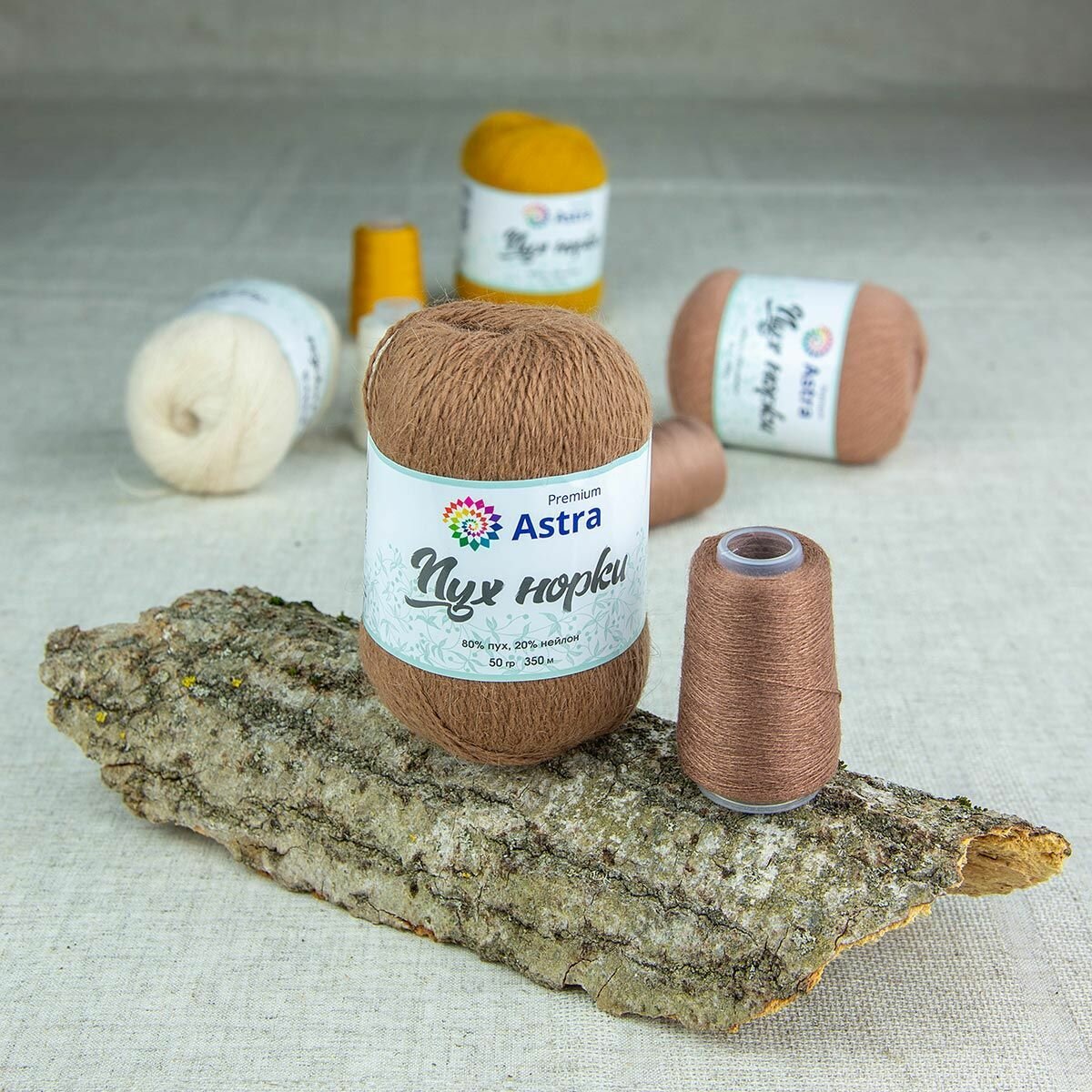 Пряжа для вязания Astra Premium 'Пух норки' (Mink yarn), 50г, 290м (80% пух, 20% нейлон) + нить 20г (029 светлый каштан)