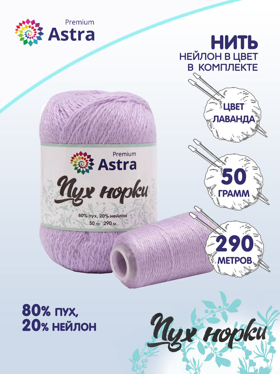 Пряжа для вязания Astra Premium 'Пух норки' (Mink yarn), 50г, 290м (80% пух, 20% нейлон) + нить 20г (024 лаванда)
