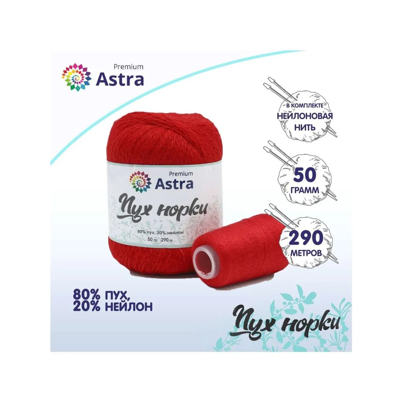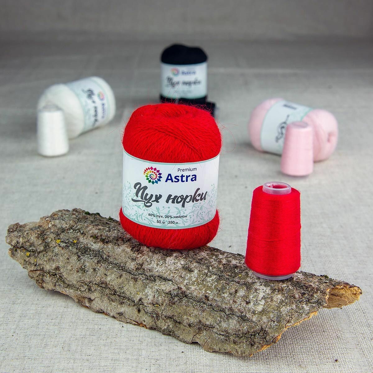 Пряжа для вязания Astra Premium 'Пух норки' (Mink yarn), 50г, 290м (80% пух, 20% нейлон) + нить 20г (010 ярко-красный)