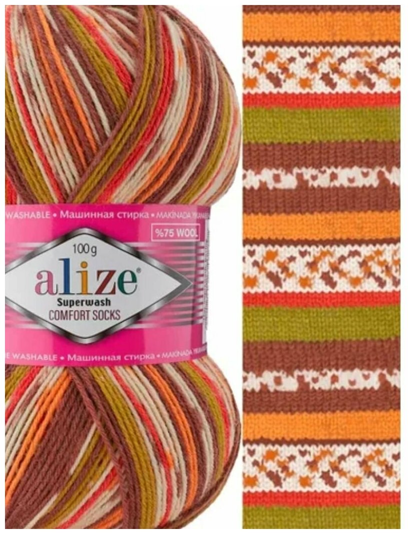 Пряжа Alize Superwash Comfort Socks (Ализе Супервош) - 1 моток, Коричневый / оранжевый / зеленый / белый (7709), 75% шерсть супервош, 25% полиамид, 420м/100г