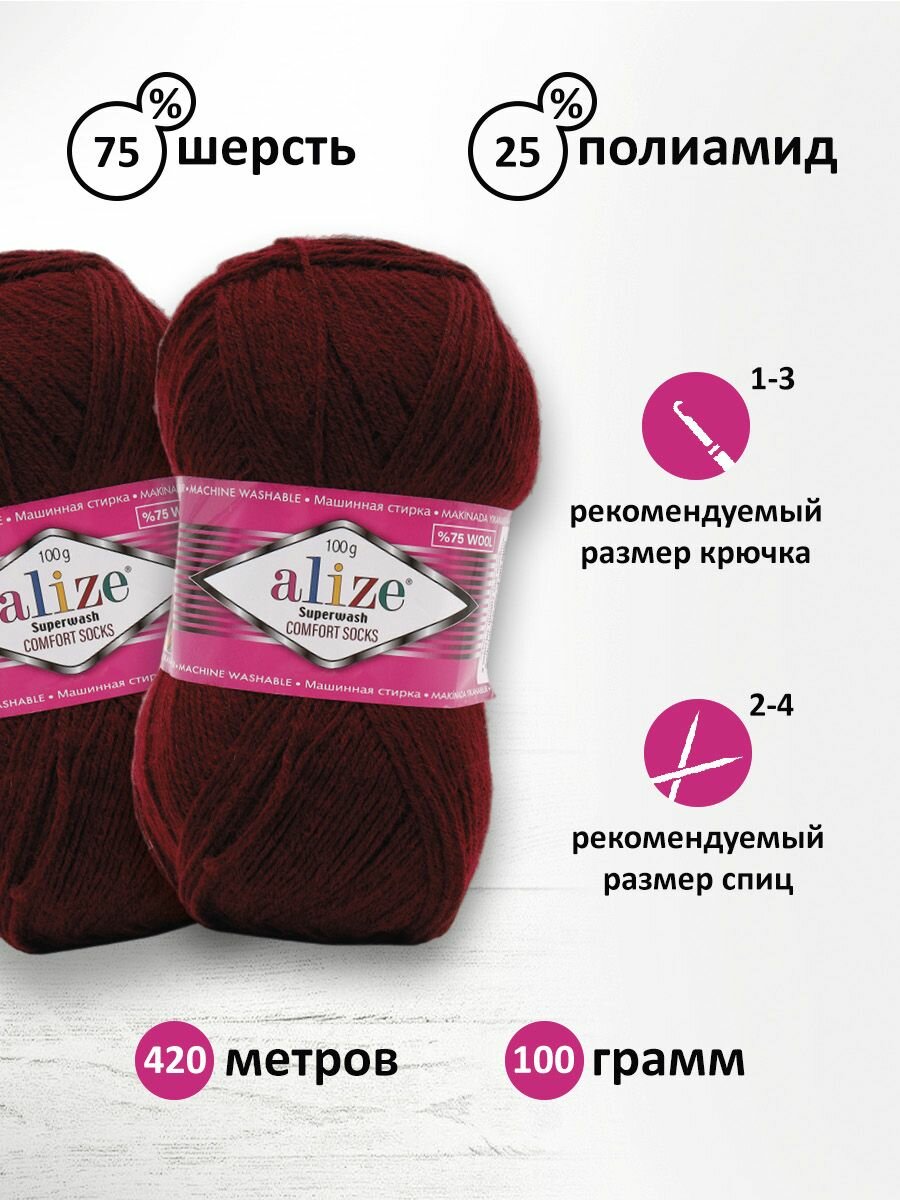 Пряжа Alize Superwash Comfort Socks (75% шерсть, 25% полиамид) 100 г 420 м, 578 бордовый , 1 моток