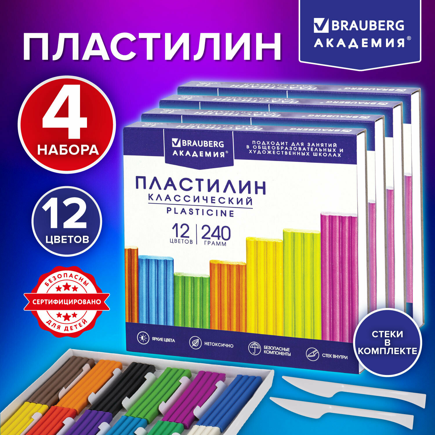 Купить Пластилин для лепки детский набор 4 штуки по 12 цветов большой, мягкий для малышей, классический в школу, 960 грамм, 4 стека, Brauberg, 881053