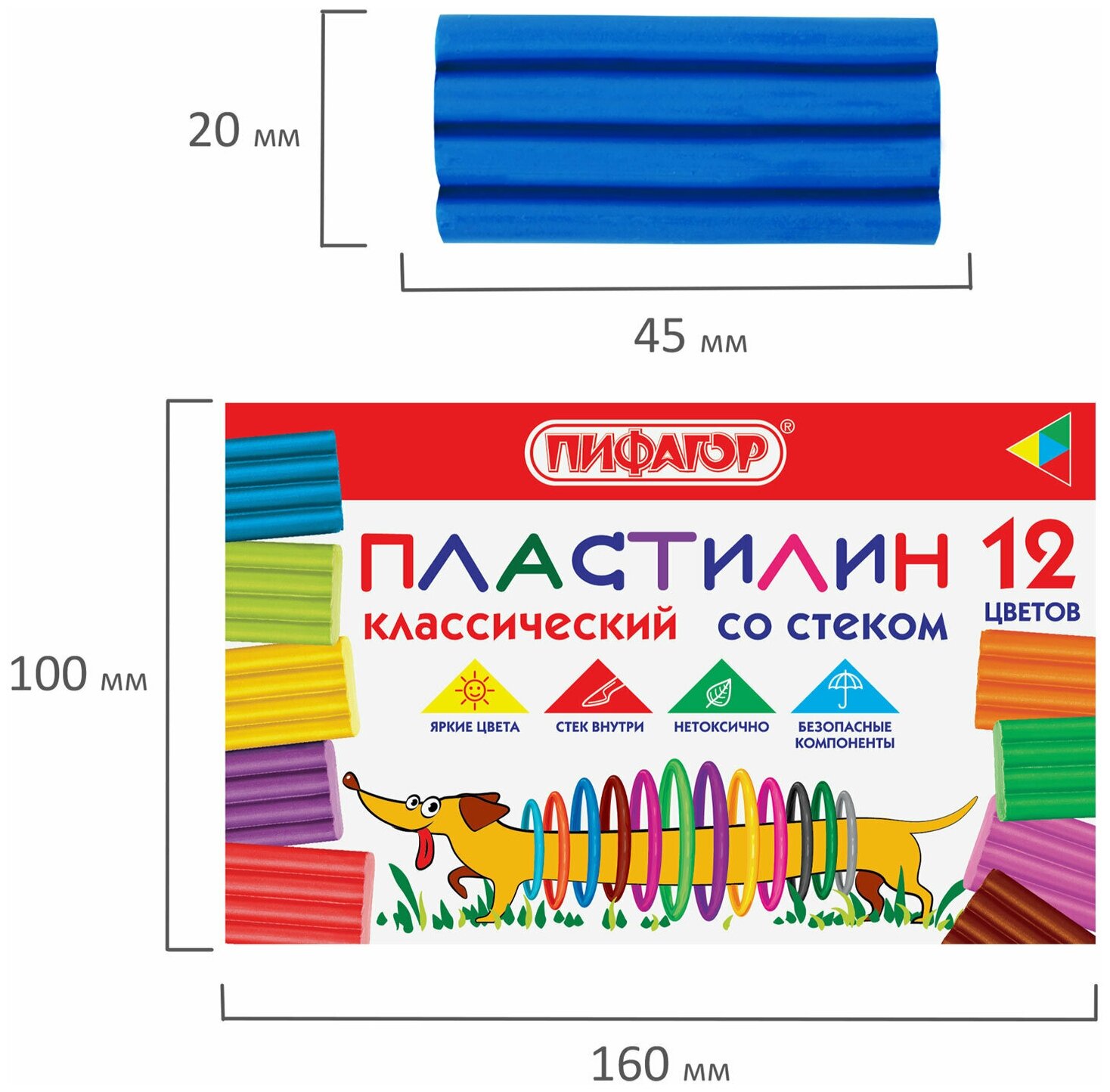 Купить Пластилин Пифагор классический, Веселая такса, 12 цветов, 180 г, со стеклом