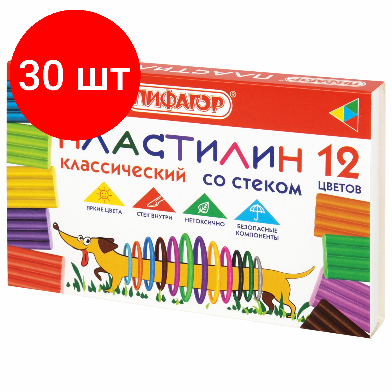 Купить Комплект 30 шт, Пластилин классический пифагор "Веселая такса", 12 цветов, 180 г, со стеком, 106675