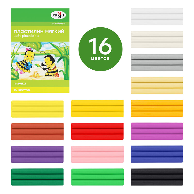 Комплект 16 шт, Пластилин восковой мягкий Гамма "Пчелка", 16 цветов, 240г, со стеком, картон. упаковка