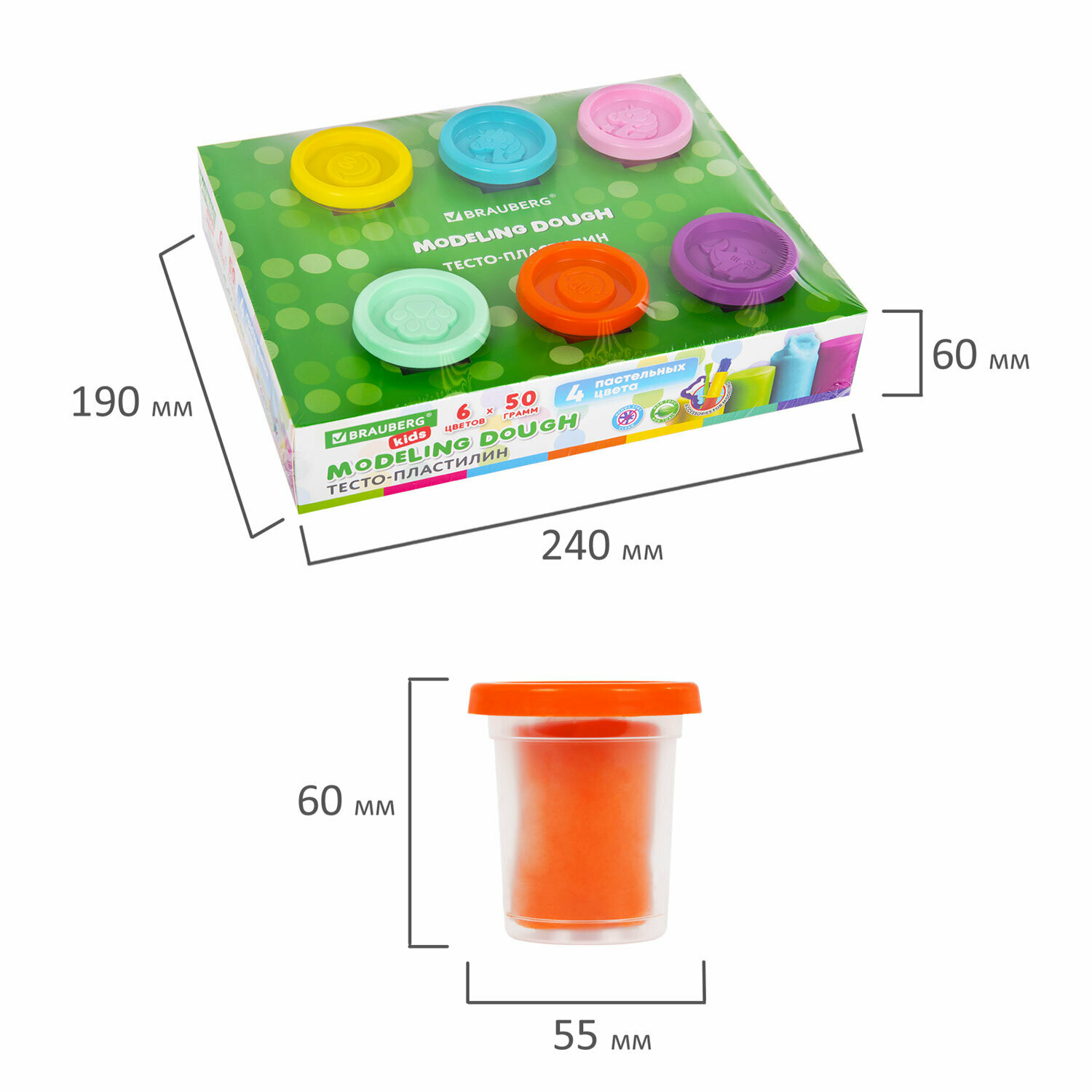 Пластилин-тесто для лепки BRAUBERG KIDS, 6 цветов, 300 г, яркие классические цвета, крышки-штампики, 106718