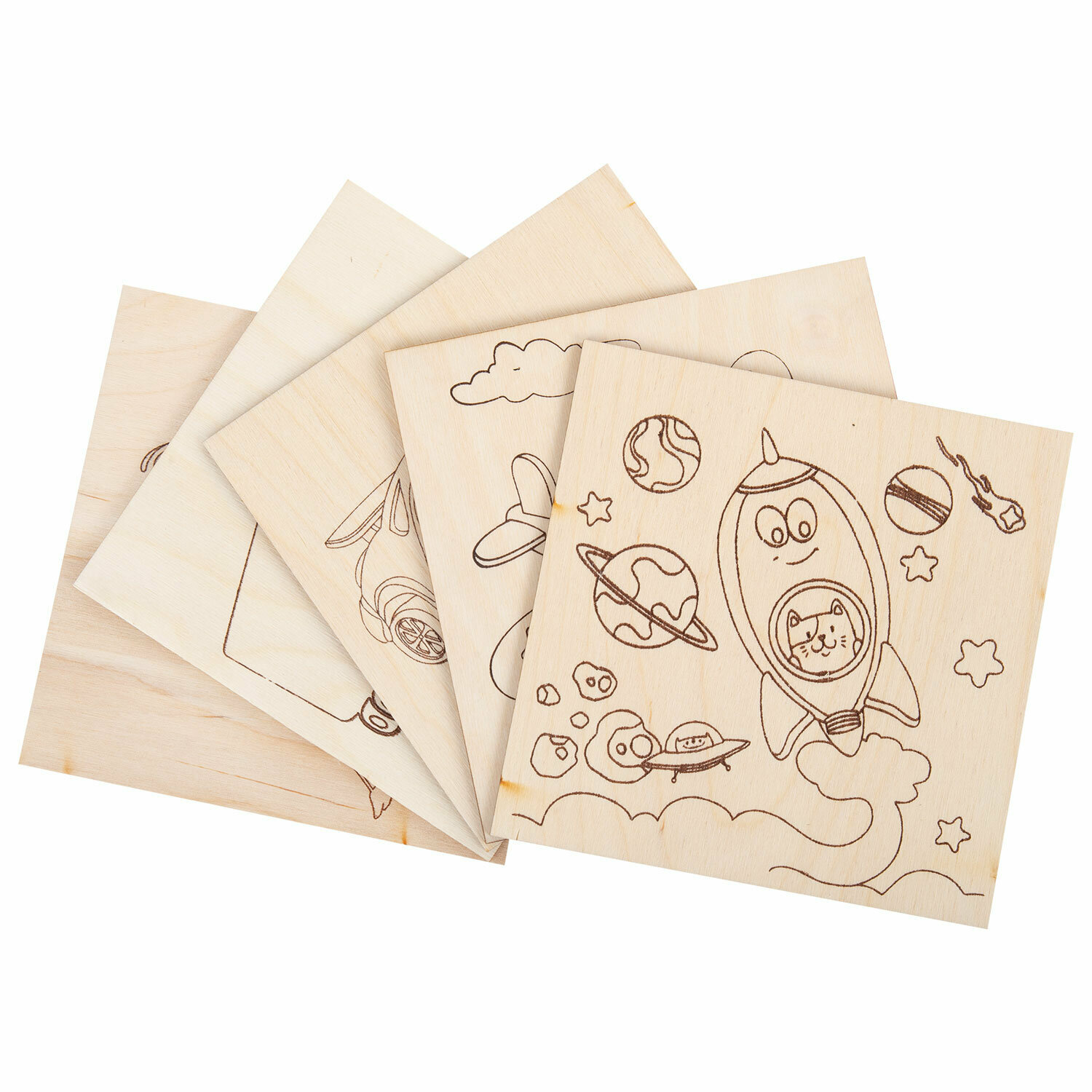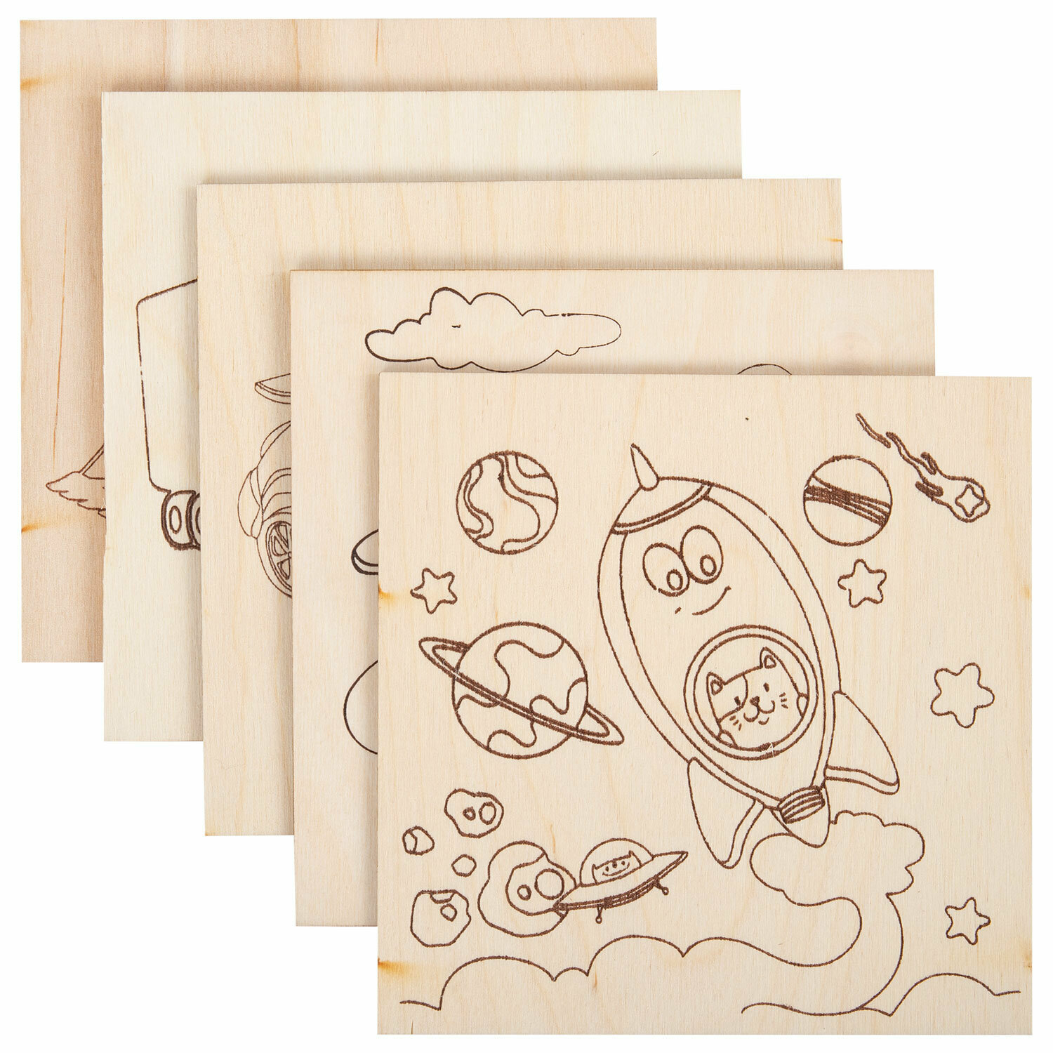 Купить Набор для выжигания по дереву, деревянные заготовки для творчества Транспорт, 5 штук 10 рисунков, 15x15 см, Brauberg Hobby, 665305