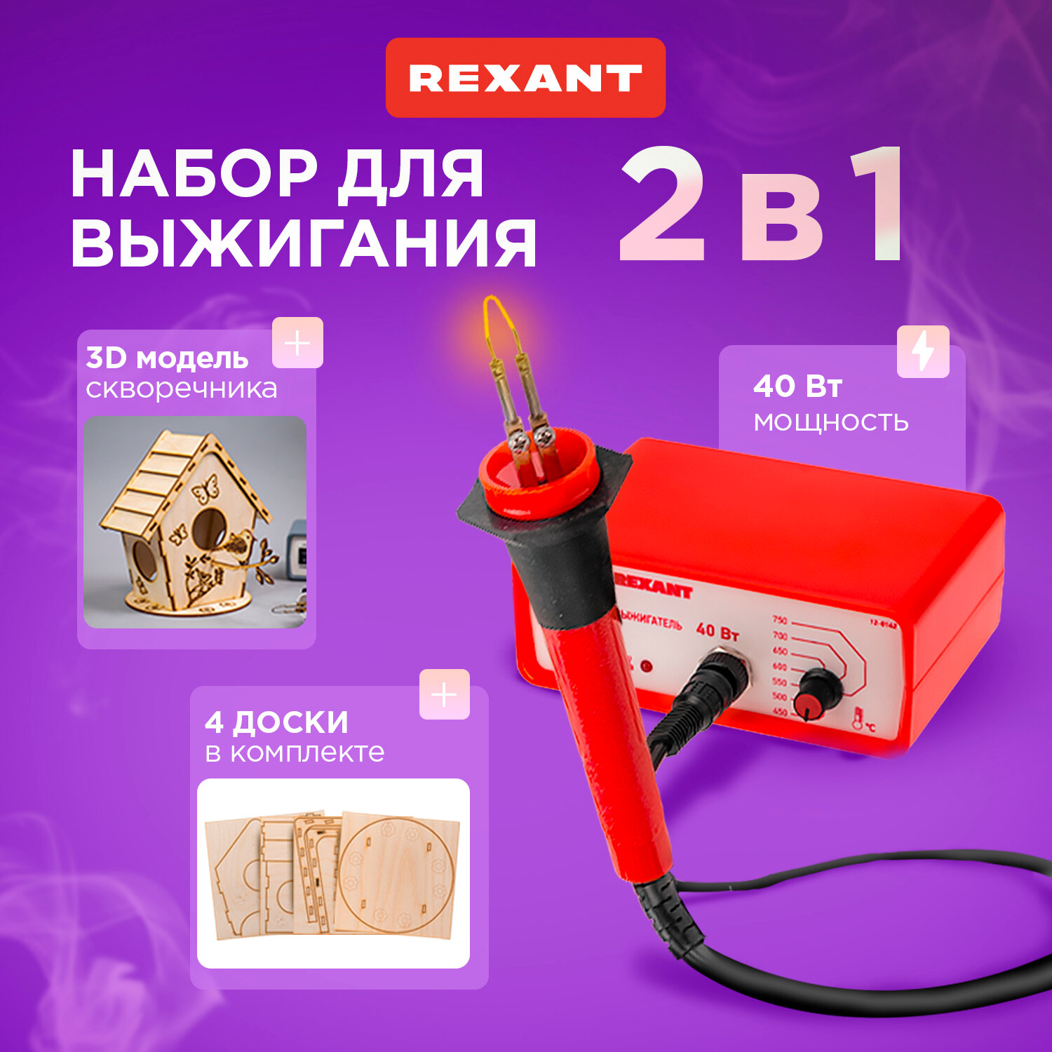 Набор Rexant 12-0929-2 для выжигания, «Для мальчиков», Выжигатель + 5 досок, 150х150 мм, пакет