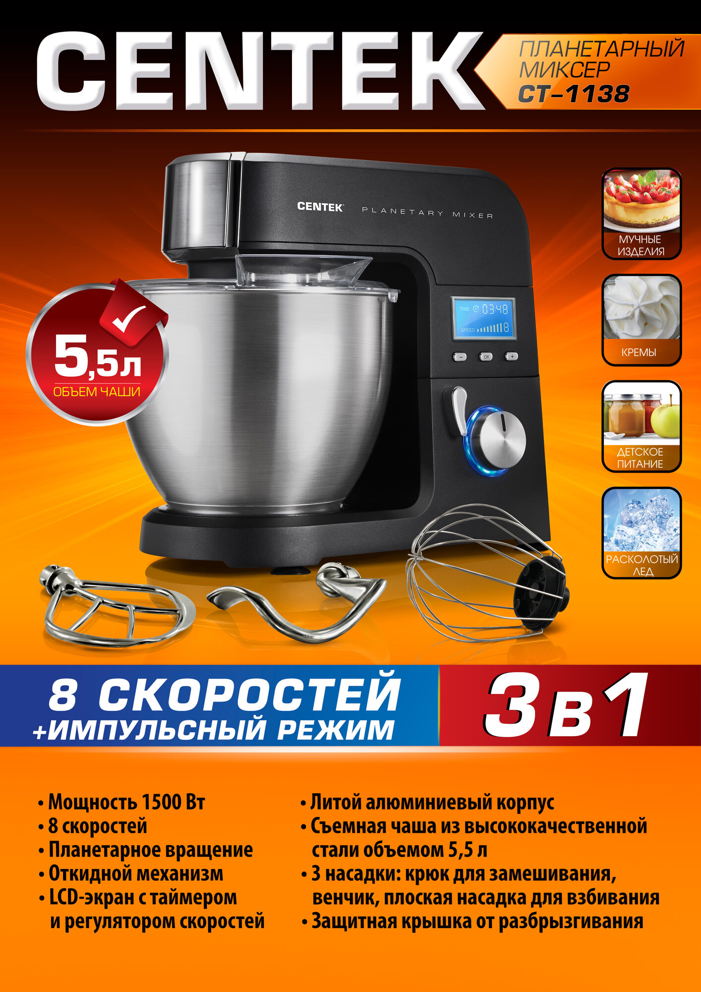 Планетарный миксер Centek CT-1138 1500Вт, Литой алюм. корпус, 5.5л, таймер, LCD дисплей, подсв