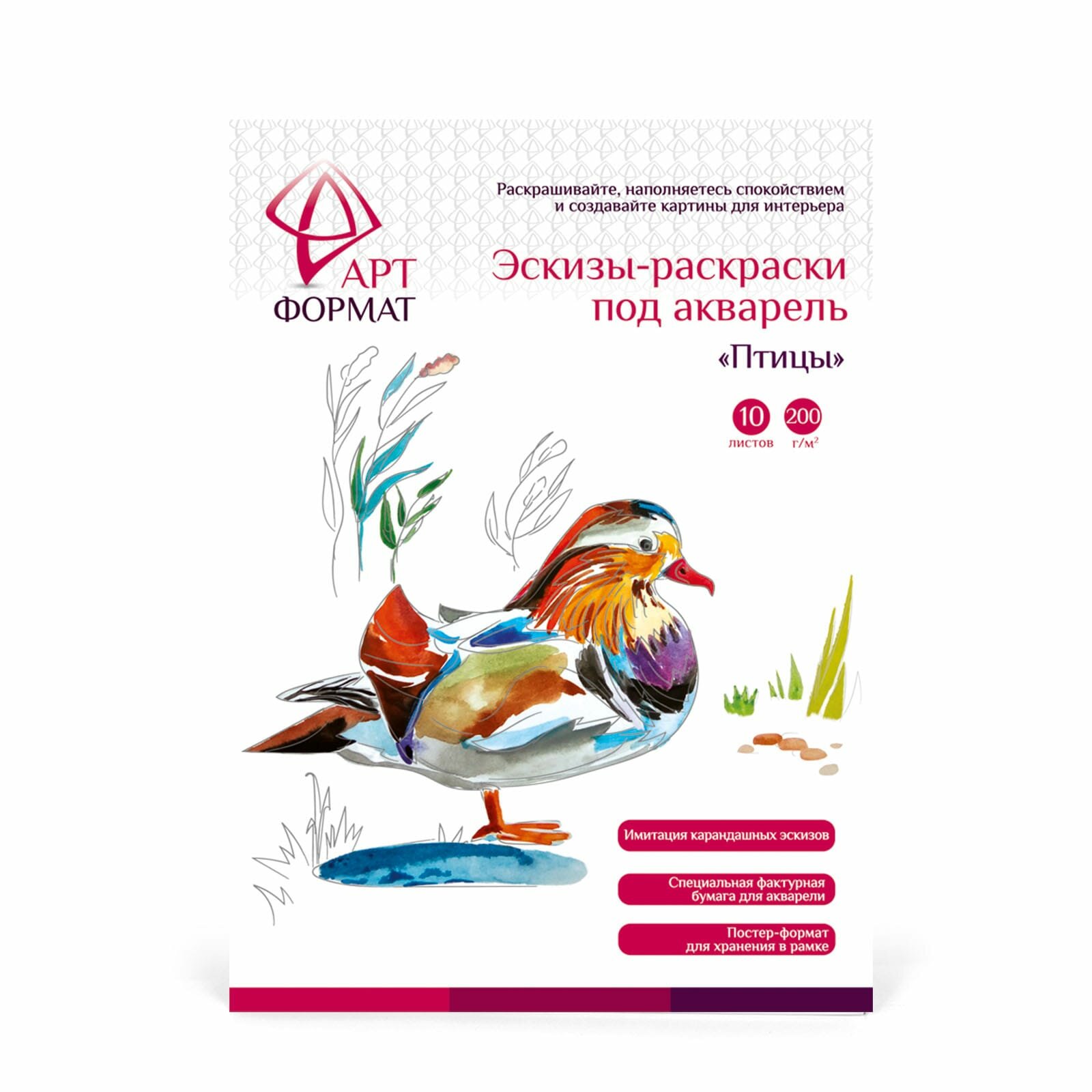 АРТформат Раскраска-эскиз "Птицы", акварельная бумага, А4, в папке, 10 листов