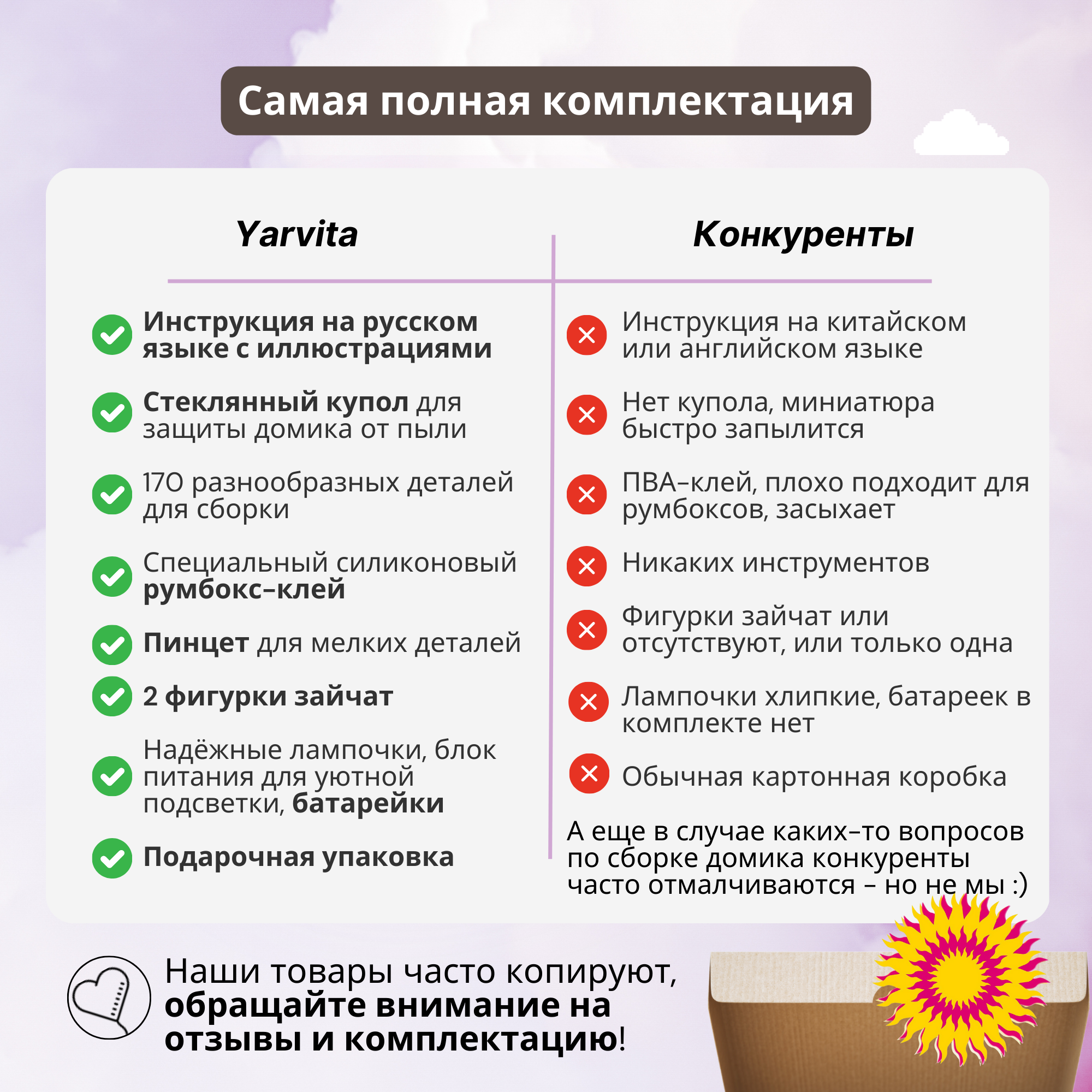 | Комплектация | Иллюстрированная инструкция на русском языке / детали для сборки / уютная светодиодная подсветка и батарейка к ней / клей / пинцет для сборки / стеклянный купол для защиты от пыли. Подробную комплектацию смотрите в описании. |