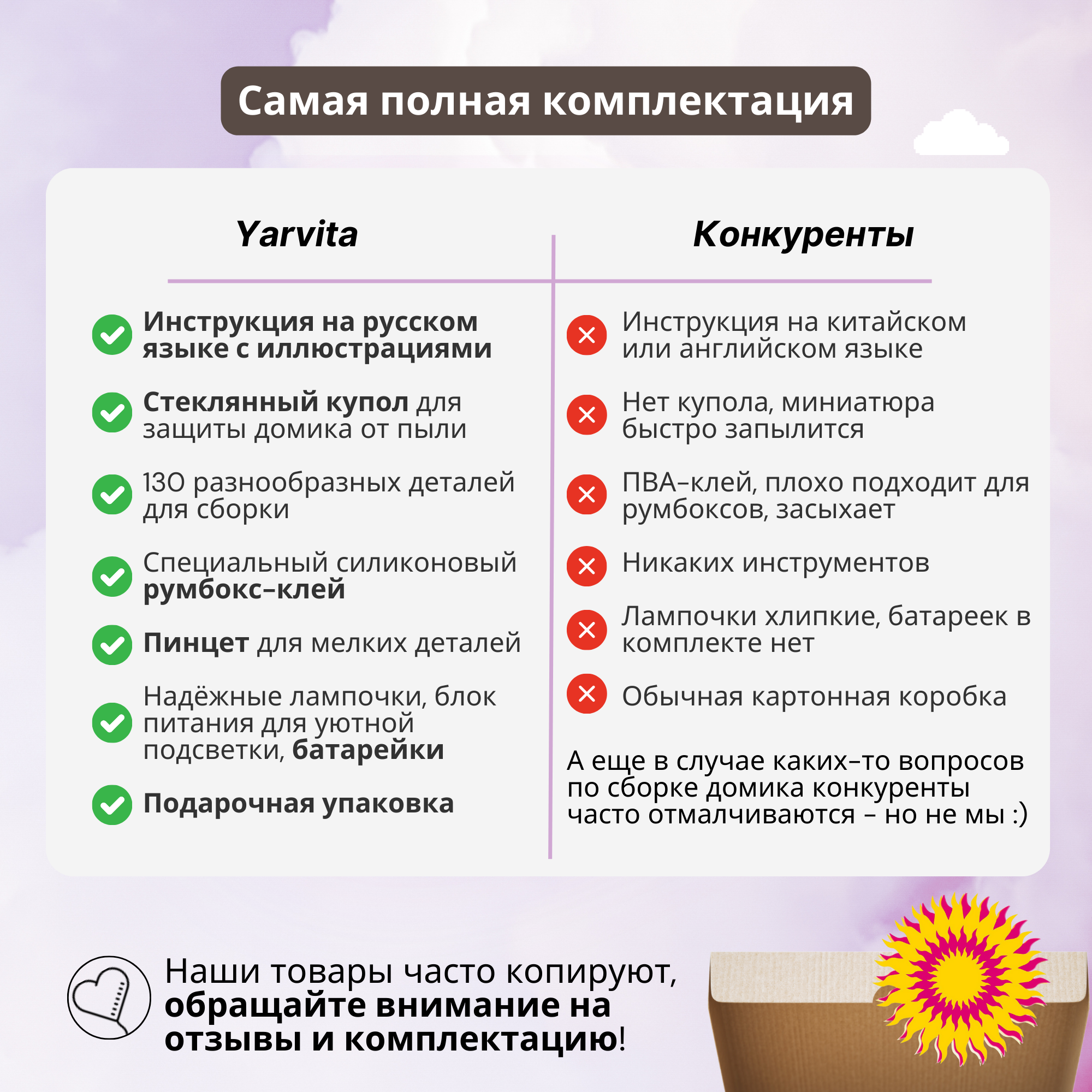 | Комплектация | Иллюстрированная инструкция на русском языке / детали для сборки / уютная светодиодная подсветка и батарейка к ней / клей / пинцет для сборки / стеклянный купол для защиты от пыли. Подробную комплектацию смотрите в описании. |