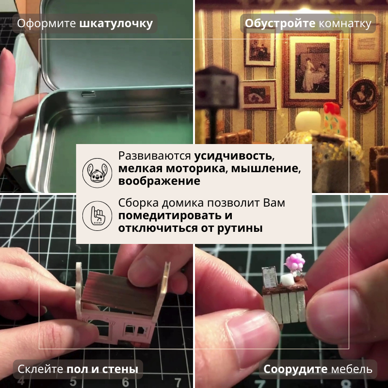| Комплектация | батарейки / пошаговая иллюстрированная инструкция на русском языке / металлическая шкатулка / стильная деревянная подставка для шкатулки / фигурки персонажей / уютная светодиодная подсветка / специальный клей / пинцет для мелких деталей / детали для сборки. Подробную комплектацию смотрите в описании. |