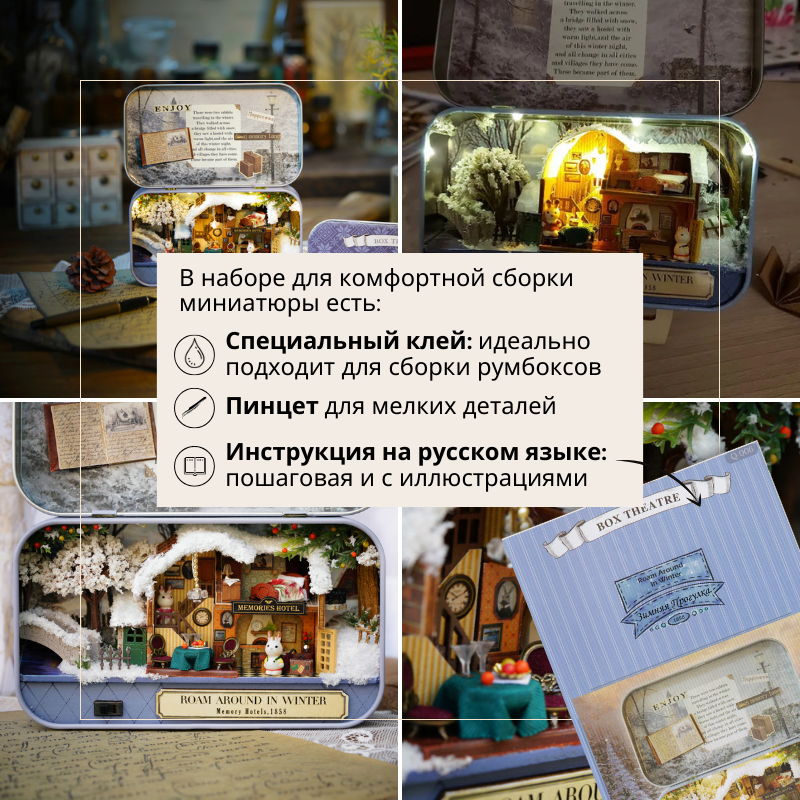 | Комплектация | батарейки / пошаговая иллюстрированная инструкция на русском языке / металлическая шкатулка / стильная деревянная подставка для шкатулки / фигурки персонажей / уютная светодиодная подсветка / специальный клей / пинцет для мелких деталей / детали для сборки. Подробную комплектацию смотрите в описании. |