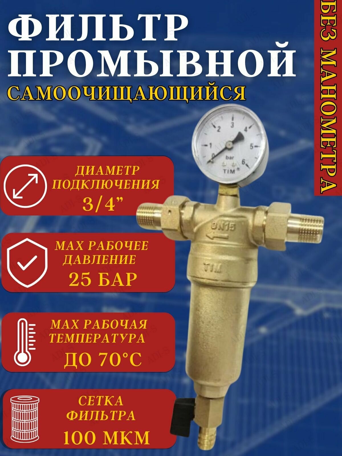 Фильтр промывной с манометром для ГВС 3/4" TIM JH-2001