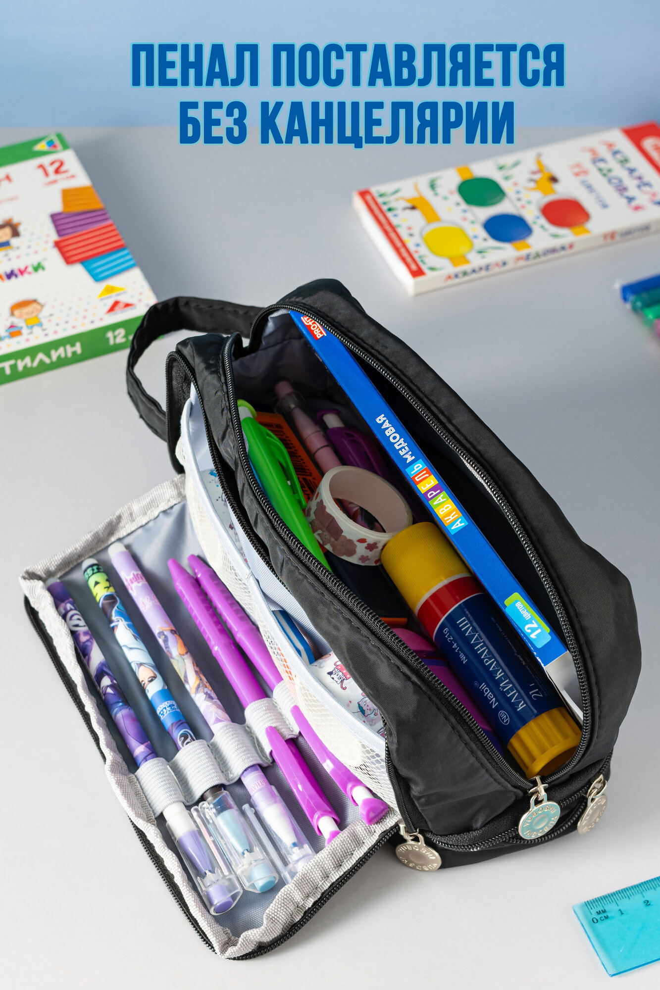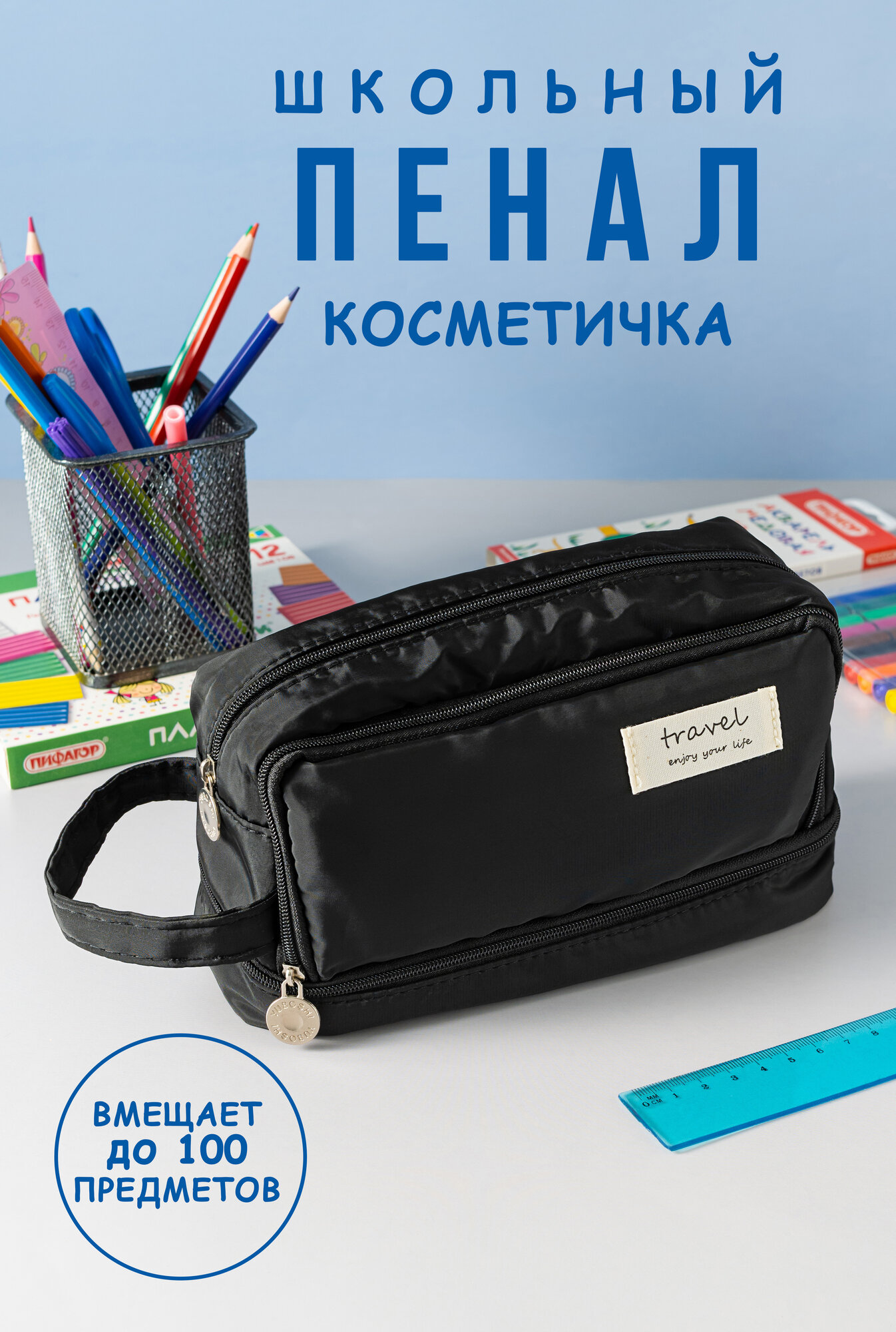 Пенал школьный подростковый вместительный черного цвета косметичка 3 отсека на молнии для девочек и мальчика интересное:
