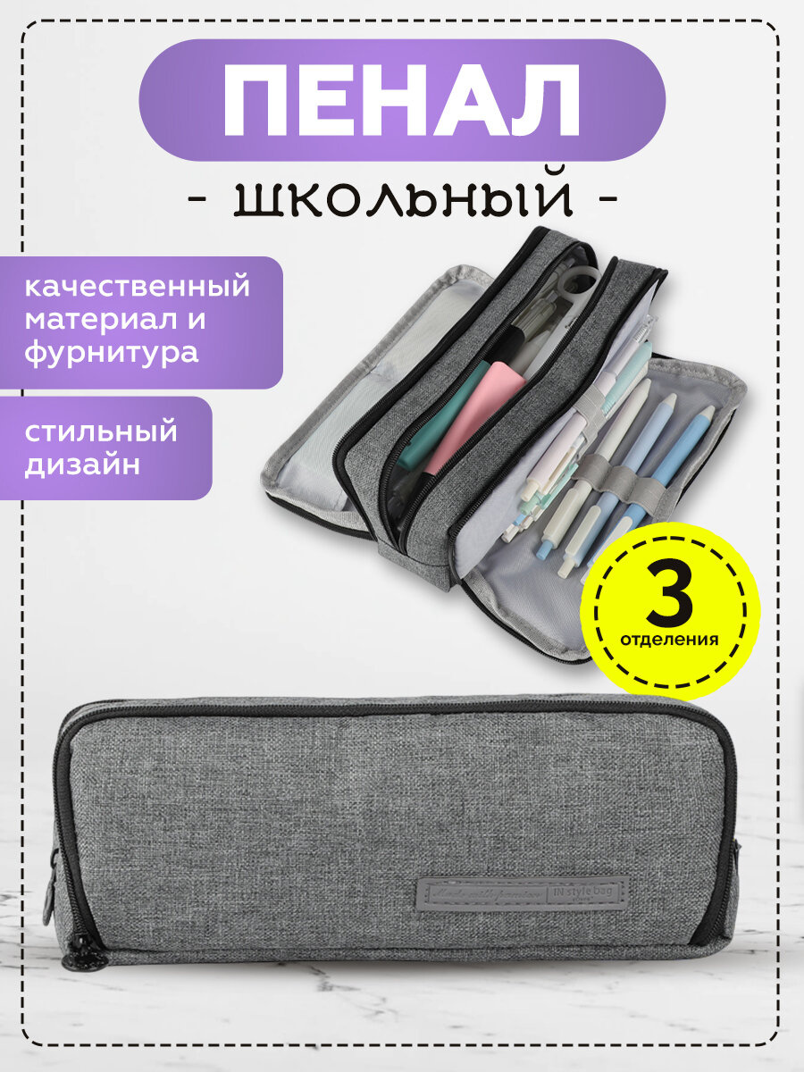 Пенал для девочек и мальчиков 3 отдела на молнии для школы, темно-серый интересное: