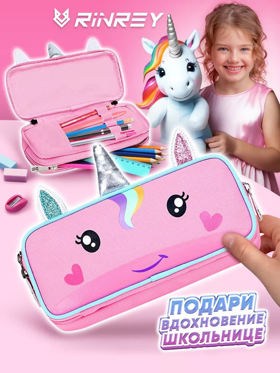 Пенал косметичка для девочек школьный с 2 отделениями модный для канцелярских принадлежностей, Единорог розовый