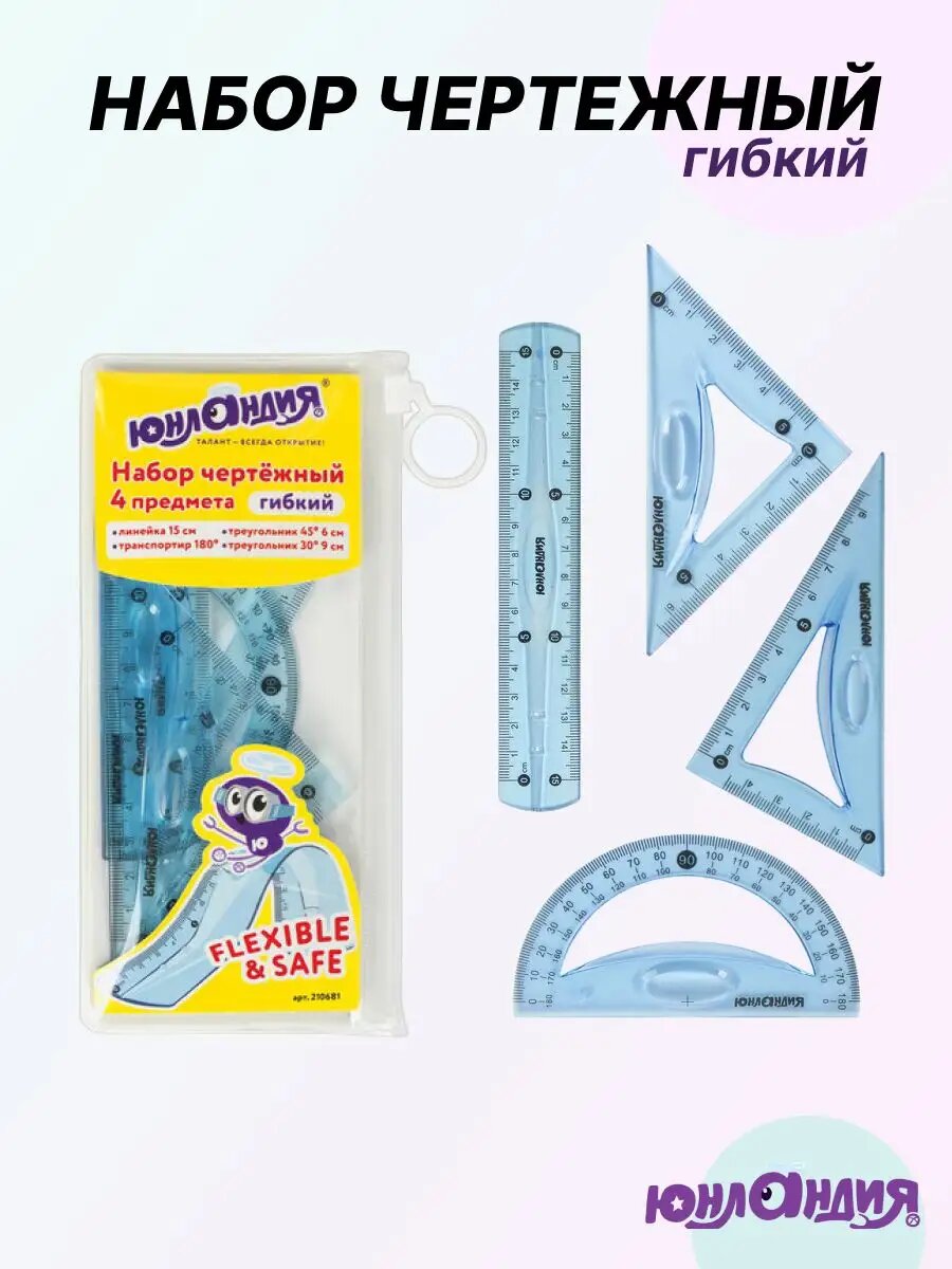 Набор чертежный Юнландия малый, гибкий "Flex", (линейка 15 см, 2 треугольника, транспортир)