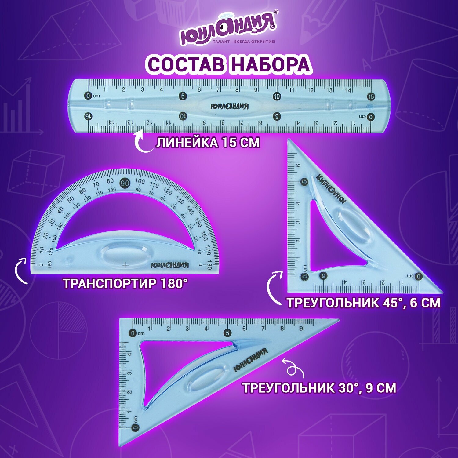 | Комплектация | Линейка -1 шт Транспортир 180' - 1 шт Треугольник 45' - 1 шт Треугольник 30' - 1 шт |