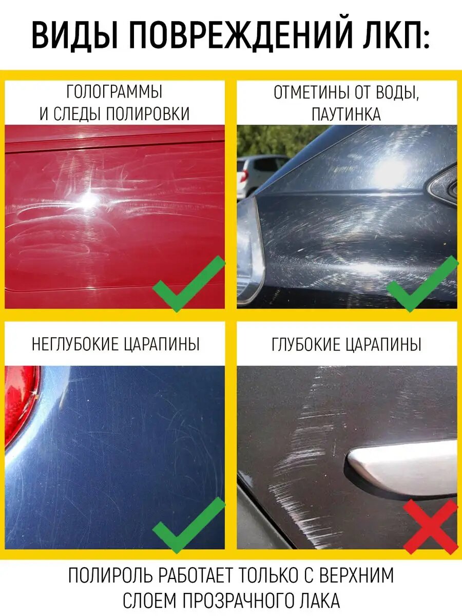 | Действие | маскирует царапины, придает блеск, устраняет царапины |
