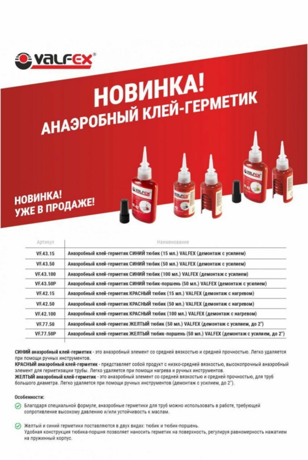 Ниже Вы можете прочитать отзывы на Клей-герметик Анаэробный для резьбы Valfex 43.15 синий, 15 мл, ознакомится с подробными характеристиками, посмотреть интересные обзоры и фотографии на Клей-герметик Анаэробный для резьбы Valfex 43.15 синий, 15 мл.