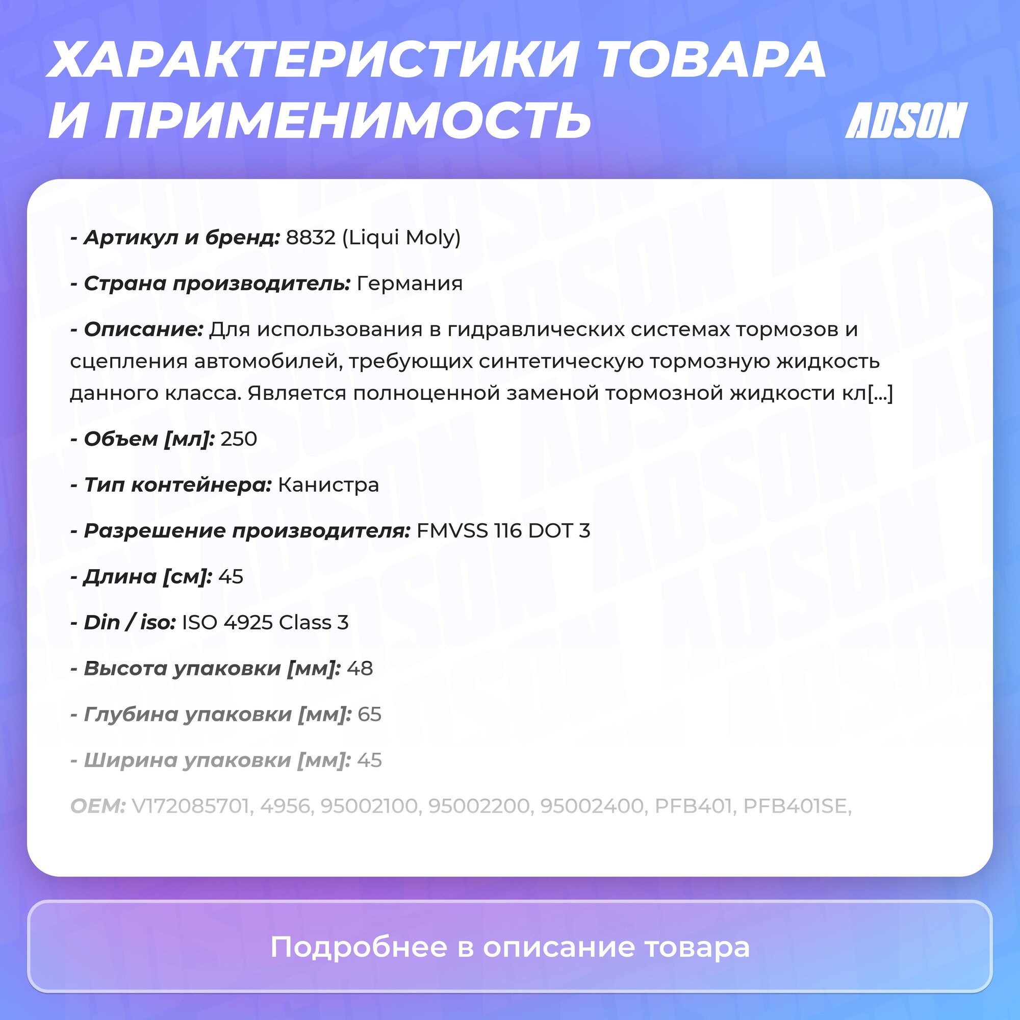 СохранитьLIQUI MOLY 8832 Жидкость тормозная LIQUI MOLY Bremsflussigkeit DOT4 0,25 л 8832/21155 интересное: