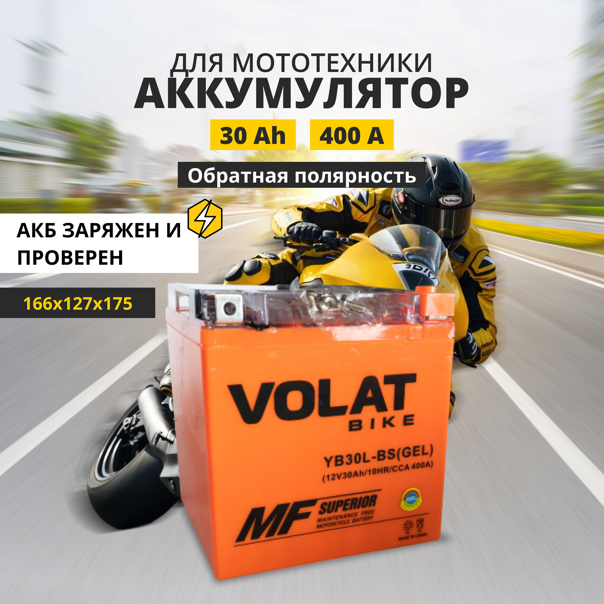 Аккумулятор для мотоцикла 12v Volat YB30L-BS(GEL) обратная полярность 30 Ah 400 A гелевый, акб на скутер, мопед, квадроцикл 166x127x175 мм интересное:
