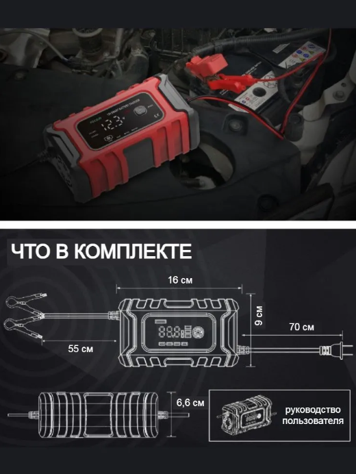 | Функции | автоматическое отключение зарядки / встроенный амперметр / встроенный вольтметр / подходит для AGM/GEL аккумуляторов / режим зимней зарядки / тест состояния АКБ |
