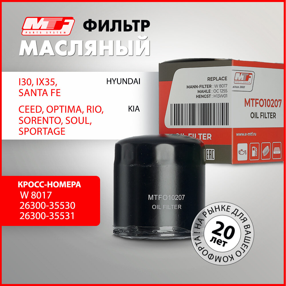 Фильтр масляный для HYUNDAI i30, i40, ix20, ix35, Santa Fe, Tucson, Veloster, KIA Carens, Cee'd, Optima, Rio, Sorento, Soul, Sportage, Venga. Кросс W8017, 2630035530, 2630035531 интересное: