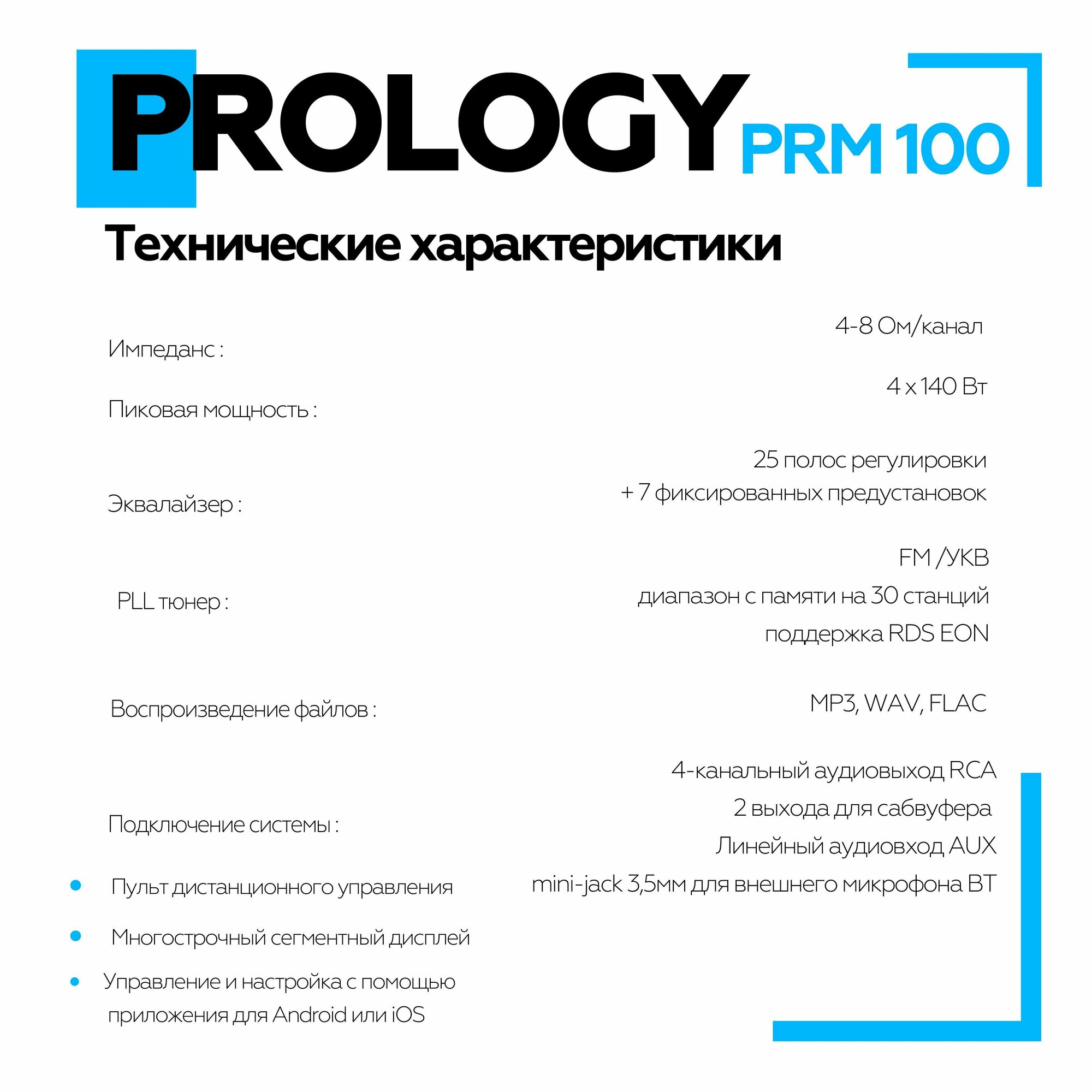 | Подробная комплектация | Устройство PROLOGY PRM-100; Соединительные кабели; Пульт дистанционного управления; Краткое руководство пользователя |