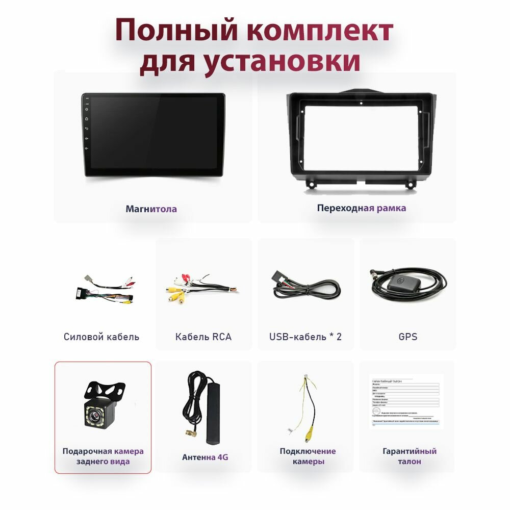 | Подробная комплектация | Головное устройство Кабель RCA Кабель силового питания Антенна 4G Антенна GPS Адаптер для SIM карты USB провод - 2шт Крепеж + болты крепления Руководство пользователя Гарантийный талон |