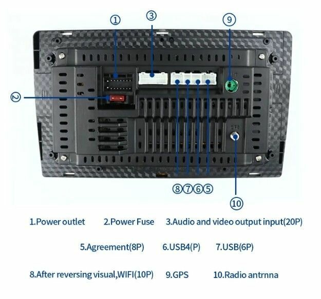 | Подробная комплектация | Магнитола - 1 шт. GPS антенна - 1 шт. USB адаптер - 2 шт. Провода на видео выходы/входы сабвуфера, усилитель, AUX - 1 шт. Провода для подключения звука и питания - 1 шт. Переходник на камеру заднего вида - 1 шт. Кронштейн - 2 шт. Инструкция для подключения - 1 шт. |